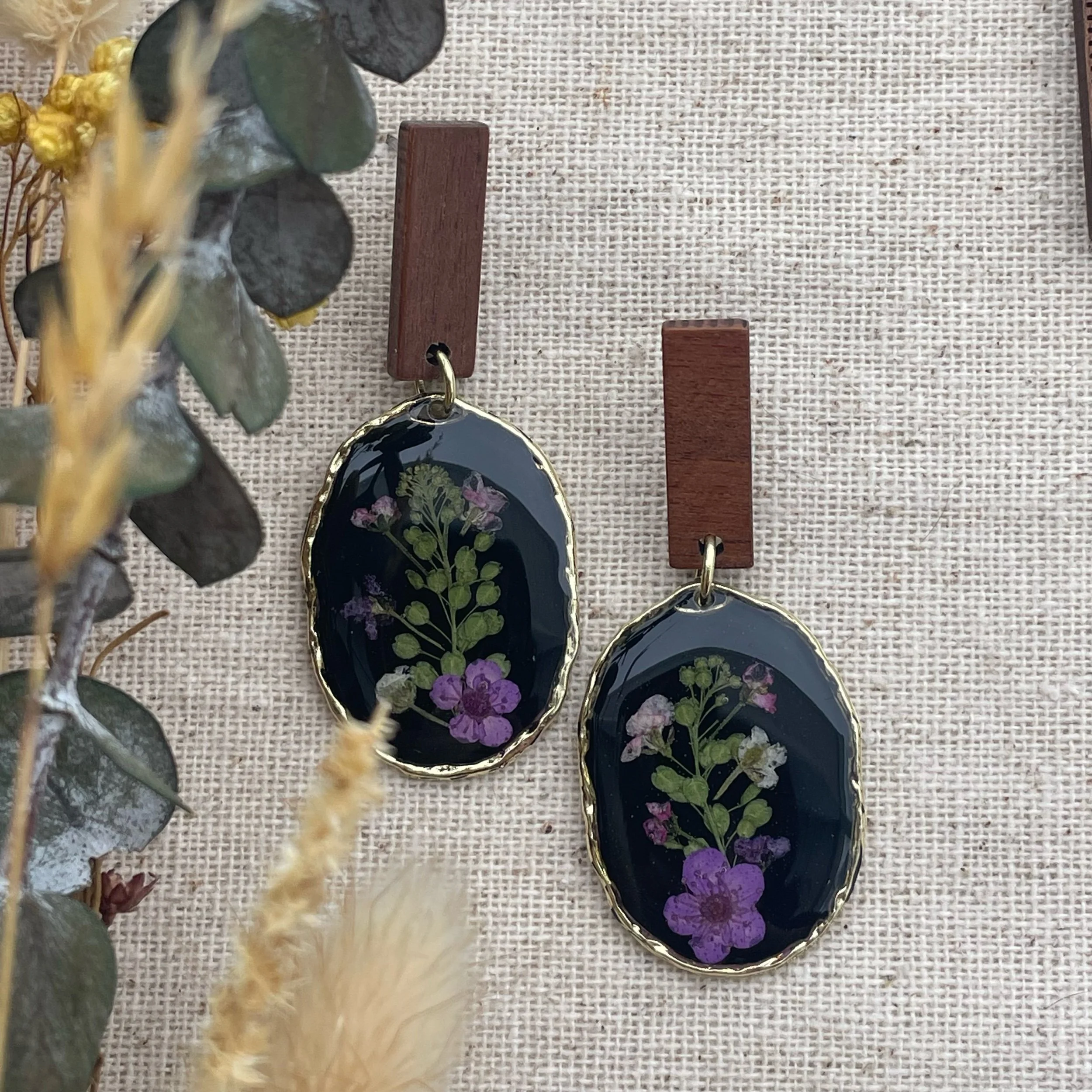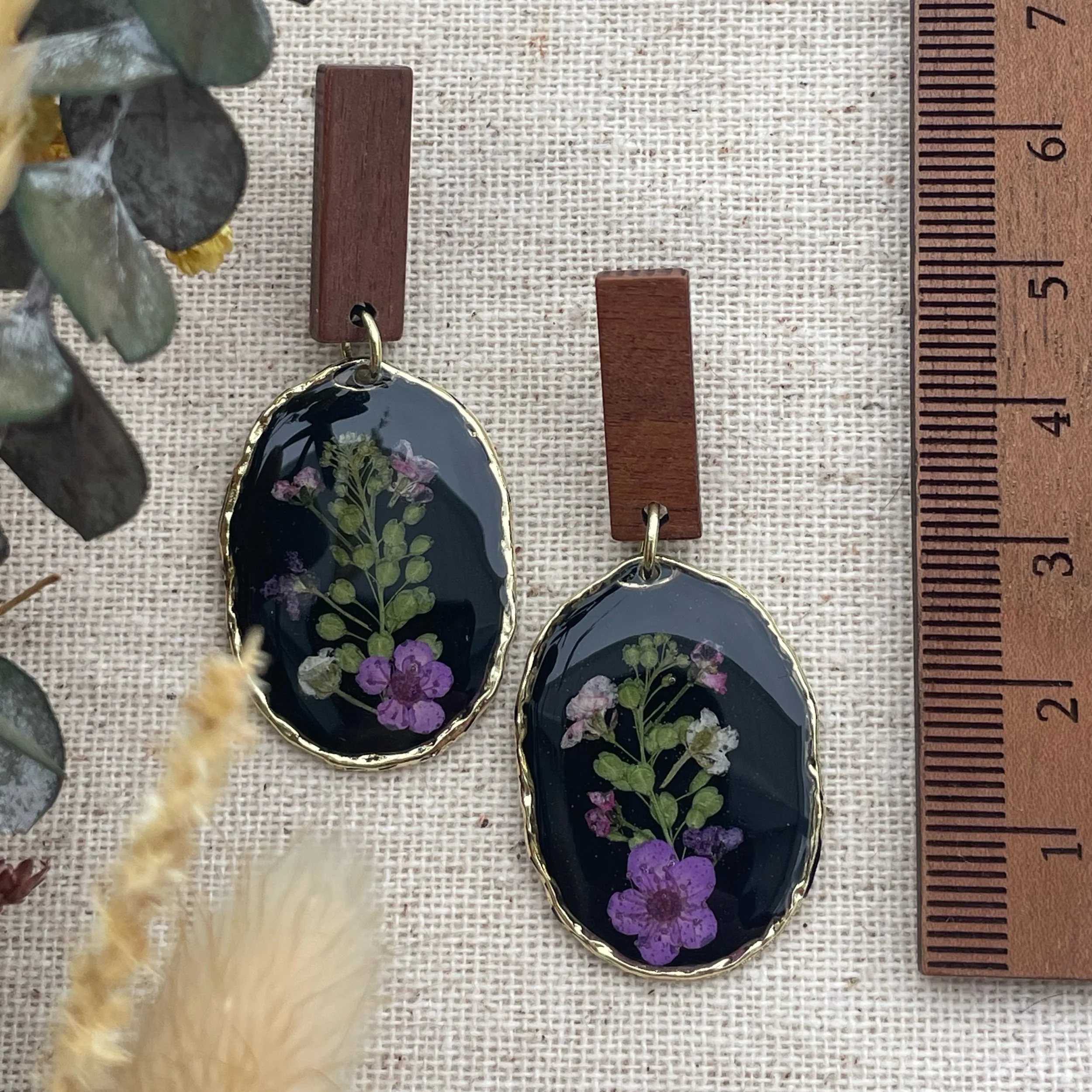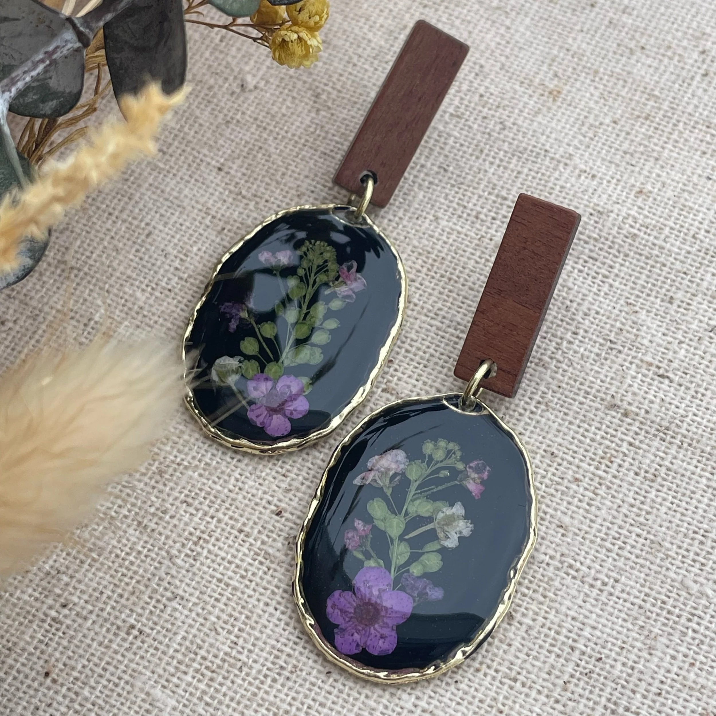 Image 1 of 3 Image 2 of 3 Image 3 of 3 Oval and wood earrings $30.00 sold out Combination flowers with purple plum blossom flowers in a black background. Wood post closureHypoallergenic Sold Out Added! Combination flowers with purple plum blossom flowers in a black background. Wood post closureHypoallergenic