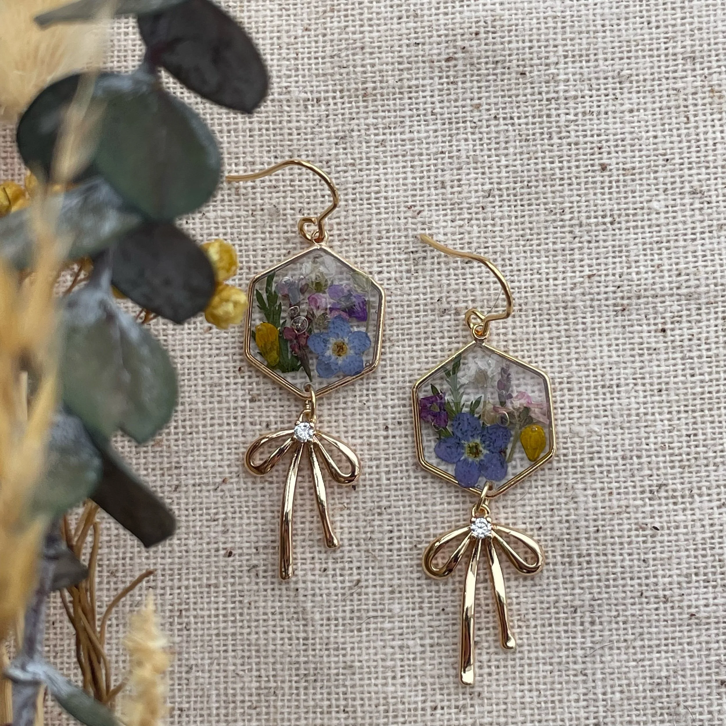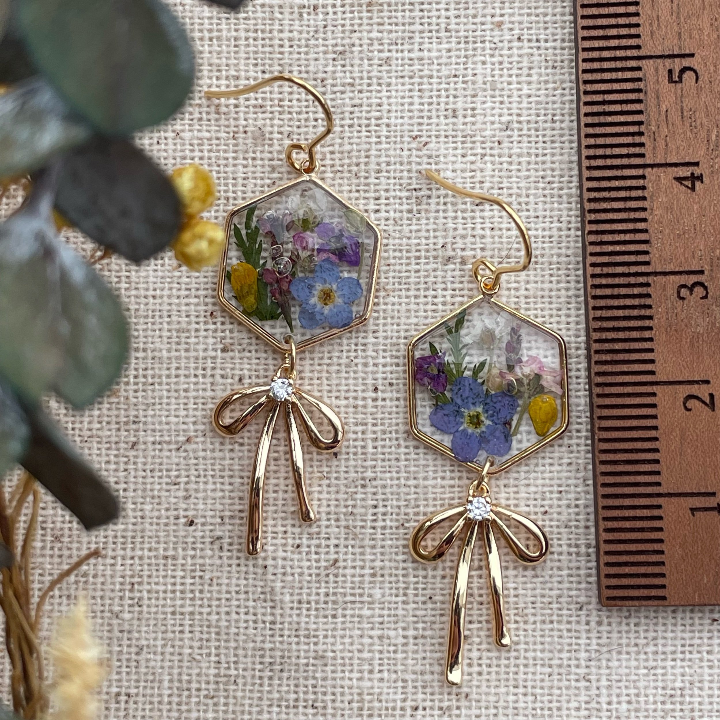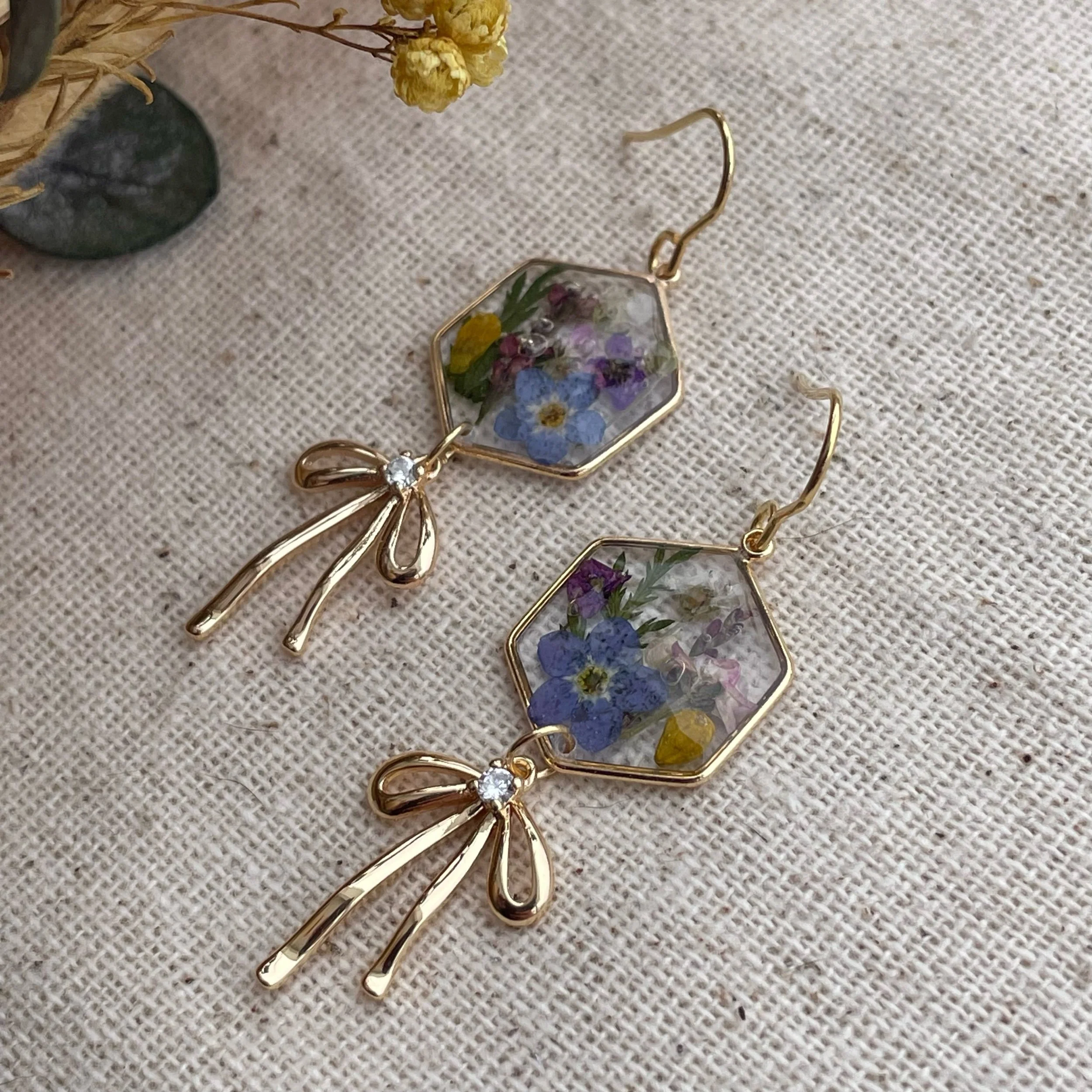 Image 1 of 3 Image 2 of 3 Image 3 of 3 Marlyn earrings $30.00 Fun, sweet earrings with bow charm! Combination of sweet alyssum and forget me not flowers. Hypoallergenic Add To Cart Added! Fun, sweet earrings with bow charm! Combination of sweet alyssum and forget me not flowers. Hypoallergenic