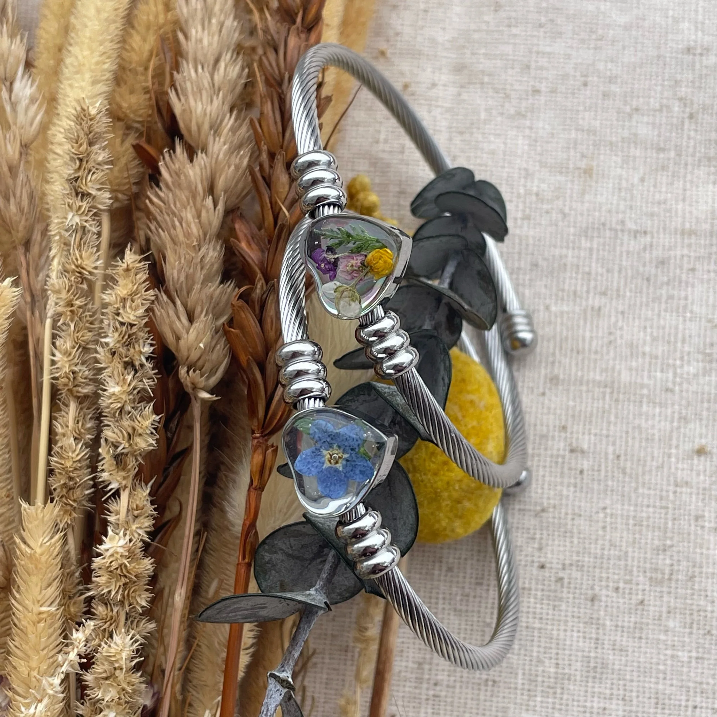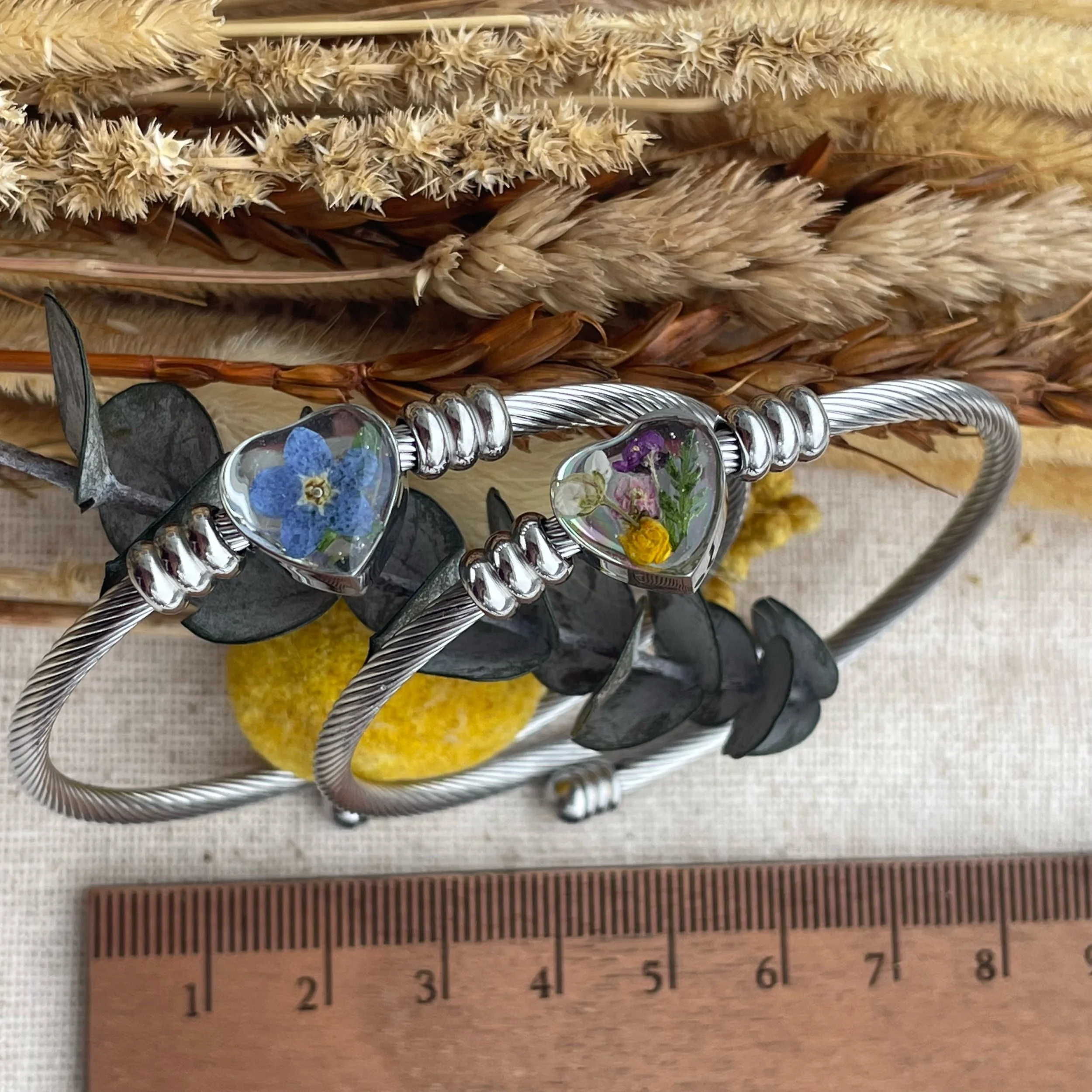 Image 1 of 3 Image 2 of 3 Image 3 of 3 Heart bangle $30.00 Forget me not heart bangles and sweet alyssum banglesStainless steel Flower: Forget me not Sweet alyssum Quantity: Add To Cart Added! Forget me not heart bangles and sweet alyssum banglesStainless steel