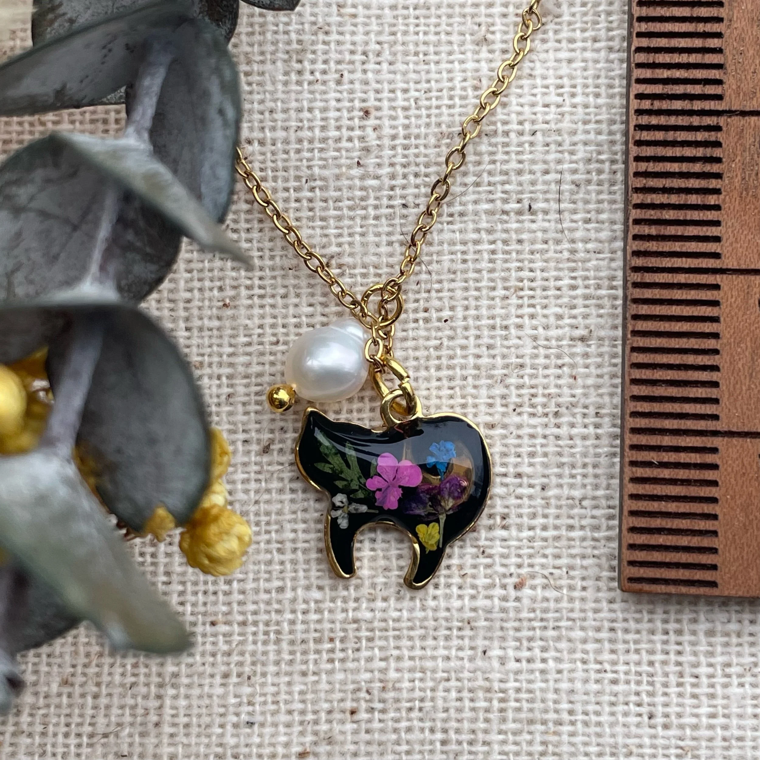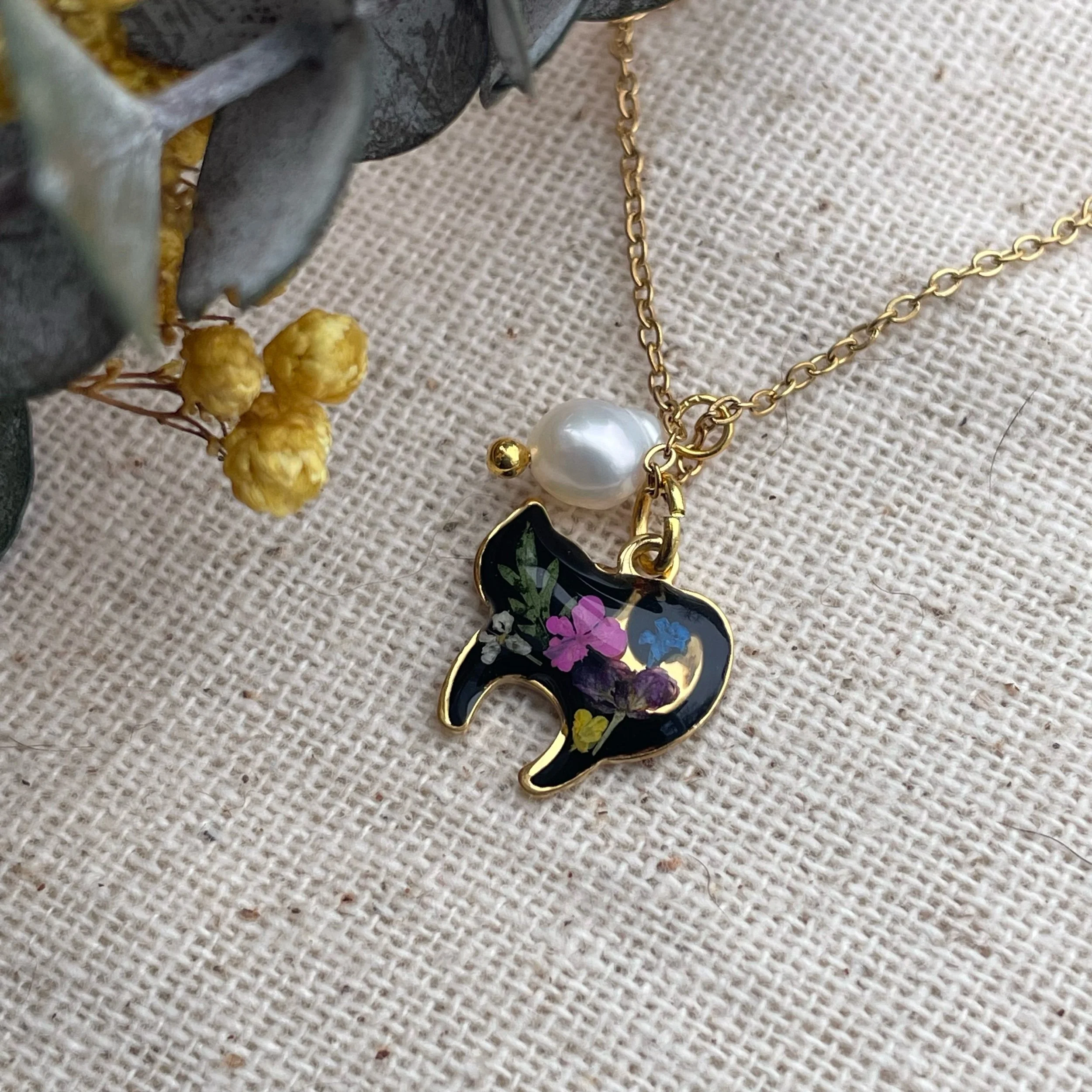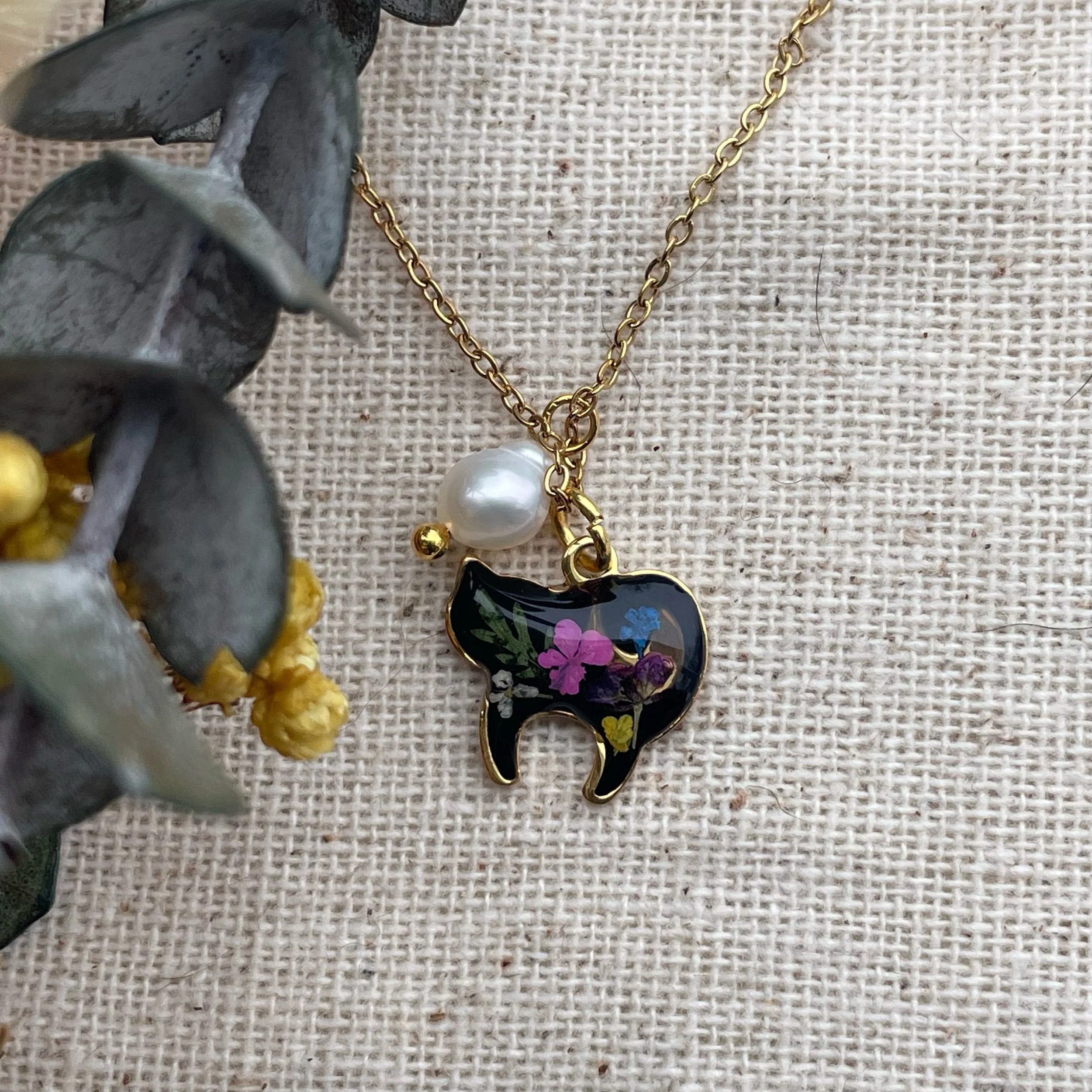 Image 1 of 3 Image 2 of 3 Image 3 of 3 Cat necklace $30.00 Dainty cat necklace with black background and sweet alyssum flowers. 18-20” stainless steel Add To Cart Added! Dainty cat necklace with black background and sweet alyssum flowers. 18-20” stainless steel